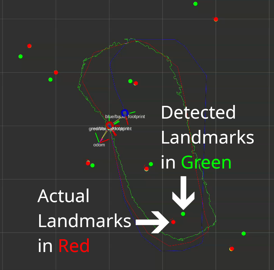 DiffDriveforward kinematics. The covariance matrix grows, reflecting increased uncertainty between sensor updates. - Update step — Each detected landmark measurement triggers a linearized Kalman update. The Jacobian of the measurement model is computed analytically and used to correct both the robot pose and the landmark positions simultaneously.