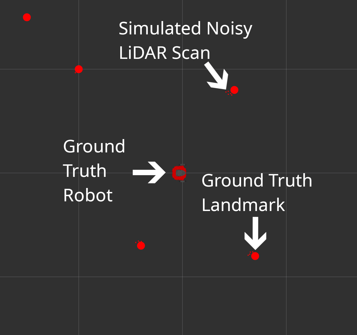- Fake sensor — Publishes noisy relative (x, y) measurements of landmarks with unique IDs, used for known-data-association testing during SLAM development.